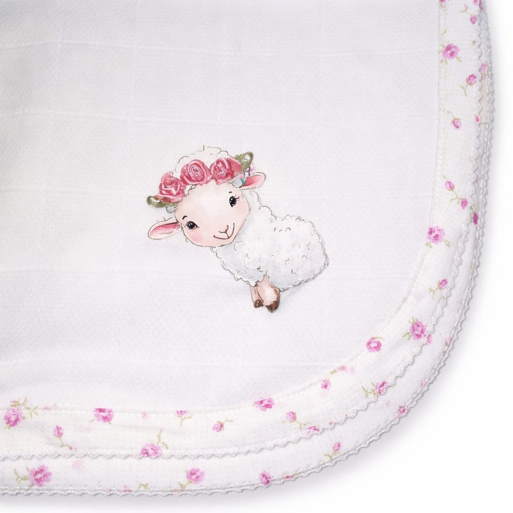 O tecido é leve, respirável e extremamente macio, adequado para peles sensíveis. A aplicação da ovelhinha com coroa de flores transmite ternura e um toque romântico, complementada por um elegante acabamento floral que valoriza a peça.
